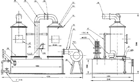 本装置是在吸收引进进口产品的基础上研究和开发的新型泄氯处理装置。该装置采用 PVC+FRP复合材料,保证了系统的耐腐蚀和结构强度。系统选用双塔式结构及特殊设计 的雾化喷咀以及上下层填料的方法,确保了对氯气的充分吸收,尤其适合对大面积的泄 氯处理和吸收。 本装置可以应用到对氯气的连续处理和吸收。 可根据用户工艺、土建要求其设计、配套各类泄氯处理装置。